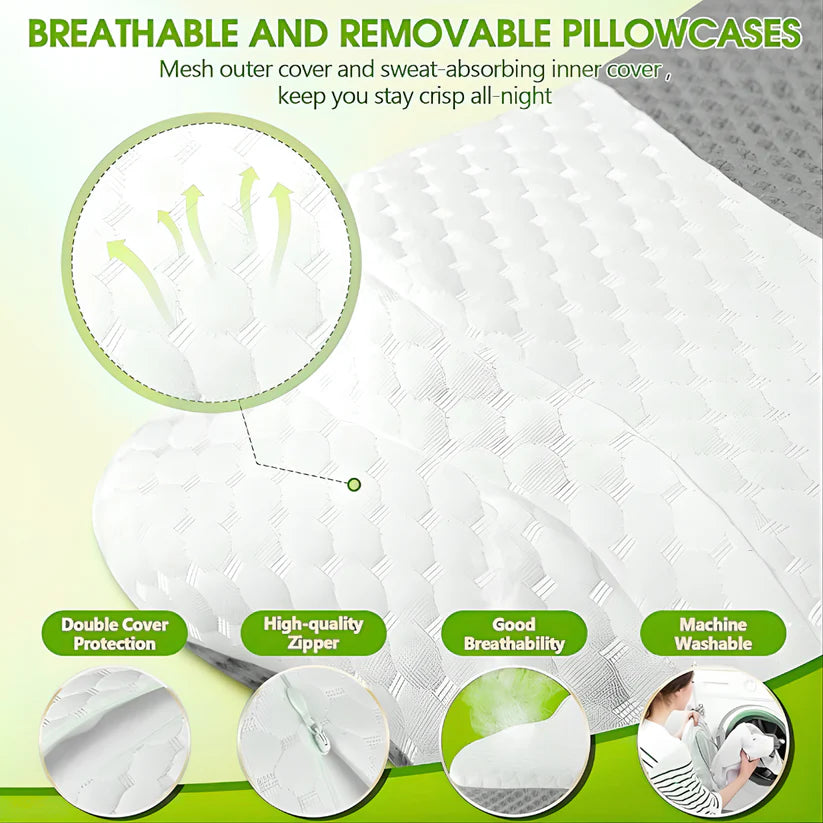 Stay cool and refreshed with the breathable Ice Silk and 3D Mesh Cooling Cover that enhances airflow and dissipates heat. The removable, machine-washable cover keeps your pillow clean, odor-free, and hypoallergenic—ensuring a cool, healthy, and stress-free sleep environment.
