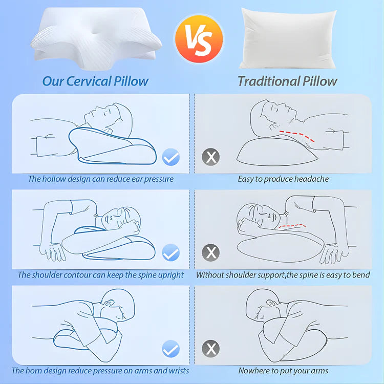 This comparison highlights how the specialized Cervical Pillow outperforms a traditional pillow for side sleepers. The unique design features a hollow center to reduce ear pressure, a shoulder contour to keep the spine upright, and a horn design to reduce pressure on the arms and wrists.