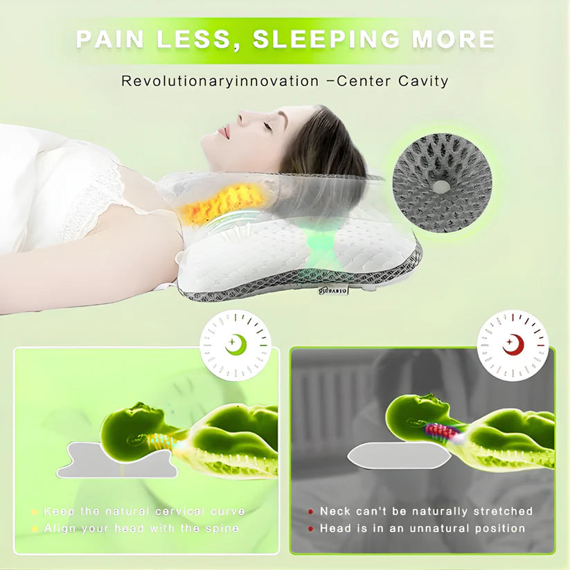 This pillow features an innovative design breakthrough—the Center Cavity—to deliver Less Pain, More Sleep! This structure works to maintain your natural cervical curvature and align your head with the spine, preventing the unnatural positioning that causes pain during sleep.